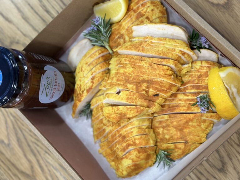 Poached rosemary & lemon organic chicken breast, sliced and accompanied by a tomato jam.
