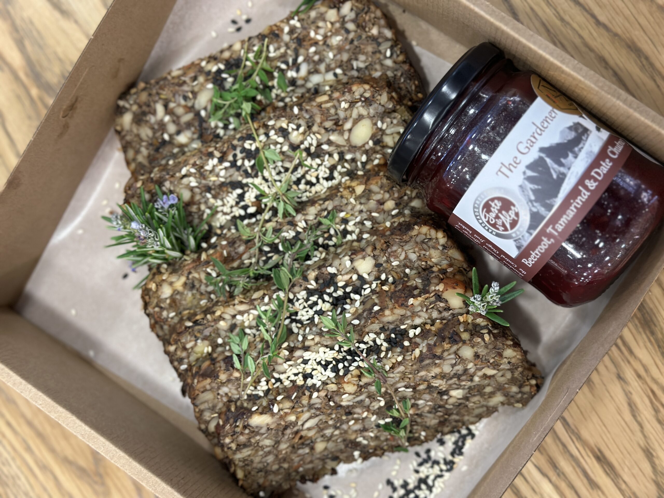 Made with mushrooms, nuts and seeds, sliced and served with a date chutney. (V, GF)