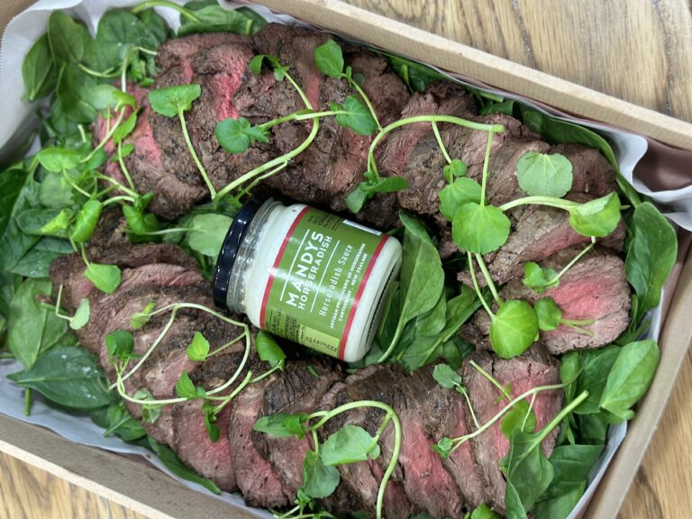 Premium NZ Eye Fillet of Beef cooked medium rare and sliced, accompanied by a horseradish sauce.